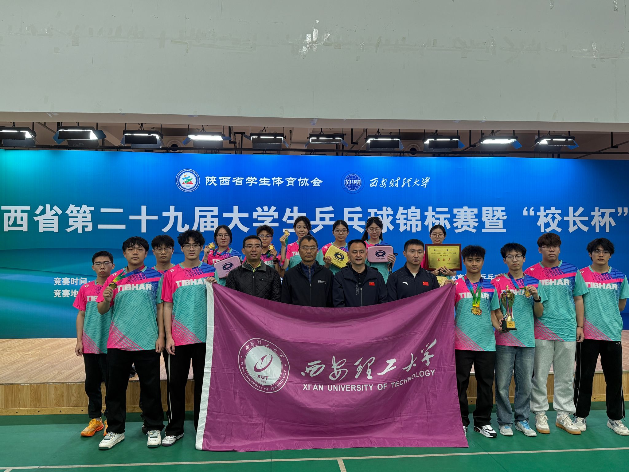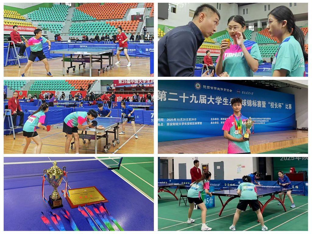 在结束西北赛区的激烈角逐后,我校乒乓球队又于10月20日至26日投身陕西省第二十九届大学生乒乓球锦标赛暨“校长杯”比赛。本次赛事由陕西省教育厅主办、陕西省大学生体育协会协办,汇聚全省70所高校的近千名运动员。在体育教学部陈栋、董宁两位教练员的联合指导下,队员们延续拼搏势头,众志成城敢打敢拼,最终拿下学生甲组(本科院校普通生)男子团体亚军、女子团体第五名的优异成绩。单项赛场同样亮点纷呈:电气工程学院杨子江同学卫冕男子单打冠军;材料学院吕行与机仪学院闫孜哲的男双组合、电气工程学院何雨阳与艺术学院刘欣的女双组合均获亚军;印包学院崔玉洁与电气工程学院杨子江的混双组合斩获季军;机仪学院杨志康、材料学院吕行同获男子单打第五名。