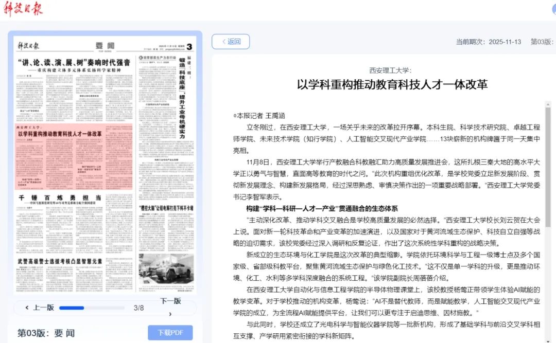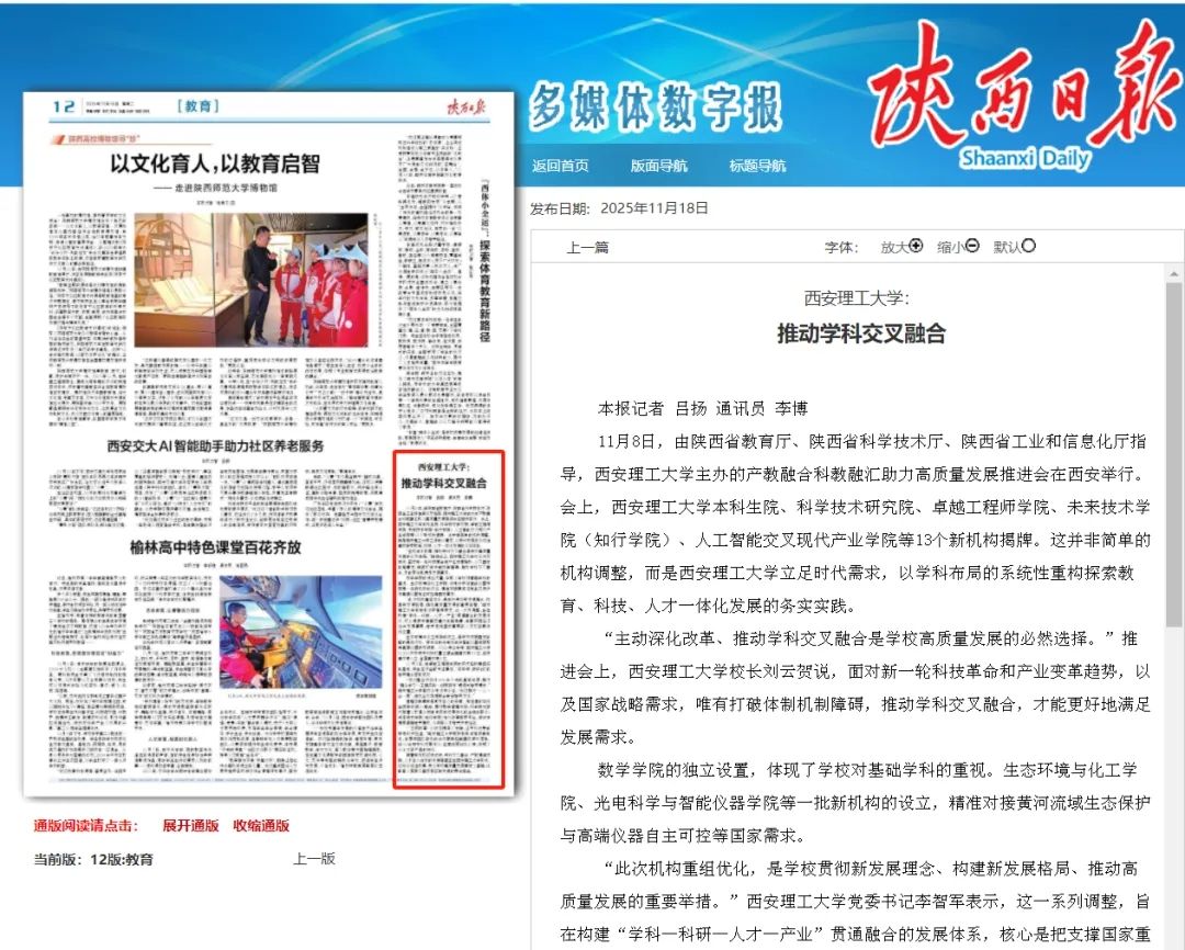 11月13日,科技日报以《西安理工大学:以学科重构推动教育科技人才一体改革》为题,深度解码西安理工大学学科系统性布局;11月17日,陕西卫视新闻联播再以《西安理工大学一体推进教育科技人才改革发展激发创新创造创业活力》为题,报道西安理工大学布局学科融合,应对黄河流域生态保护、人工智能、高端仪器的产业需求;11月 18日,陕西日报再以《西安理工大学:推动学科交叉融合》跟进聚焦,三大权威媒体相继发声,与此前30家中央省市媒体的集中报道形成呼应,500万+全网阅读量的热度背后,是社会各界对西理工冲刺“双一流”的高度关注与深切期许。