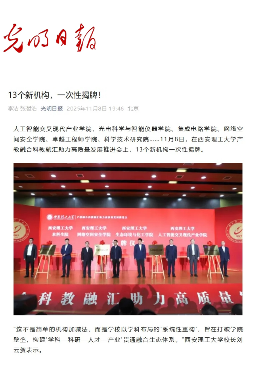 11月8日,由陕西省教育厅、陕西省科学技术厅、陕西省工业和信息化厅指导,西安理工大学主办的产教融合科教融汇助力高质量发展推进会在西安举行。会上,西安理工大学本科生院、科学技术研究院、卓越工程师学院、未来技术学院(知行学院)、人工智能交叉现代产业学院等13个新机构揭牌。这并非简单的机构调整,而是西安理工大学立足时代需求,以学科布局的系统性重构探索教育、科技、人才一体化发展的务实实践。