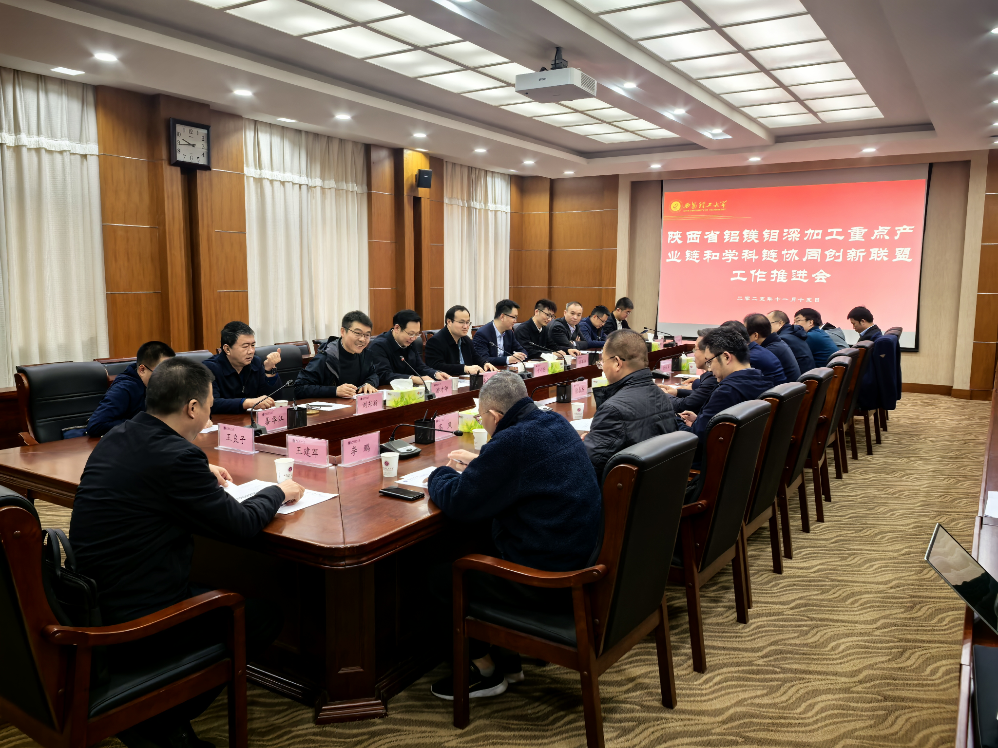 日前,“陕西省铝镁钼深加工重点产业链和学科链协同创新联盟”在我校揭牌成立。11月15日,联盟第一次工作推进会在我校金花校区召开。陕西省教育厅科技处长于小亮、我校副校长朱记伟出席座谈会、各联盟成员单位负责人或技术专家共同参会。会议由科学技术研究院常务副院长游才印主持。