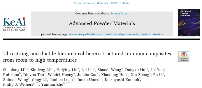 近日,我校材料科学与工程学院粉末冶金与增材制造金属基复合材料课题组在先进金属结构材料领域取得重要突破,相关研究结果以“Ultrastrong and ductile hierarchical heterostructured titanium composites from room to high temperatures”为题发表于材料领域国际顶级期刊《Advanced Powder Materials》(影响因子:24.9)。该成果由西安理工大学联合香港城市大学、英国曼彻斯特大学、日本大阪大学及北京高能物理研究所等单位合作完成。西安理工大学为第一作者单位,材料学院博士生李少龙为论文第一作者,西安理工大学李树丰教授、香港城市大学朱运田教授(联合培养博士生导师、西安理工大学名誉教授)和英国曼彻斯特大学Philip J. Withers教授为论文的共同通讯作者。