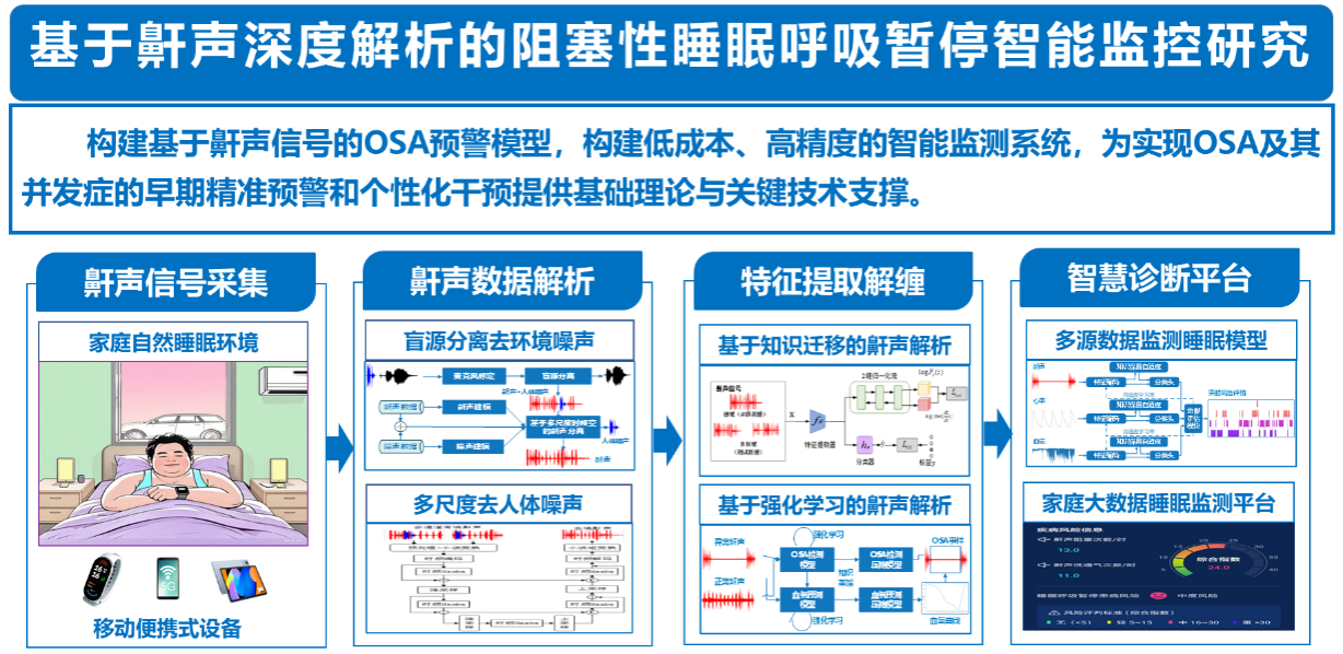 计算机科学与工程学院王晓帆教授主持的“基于鼾声深度解析的阻塞性睡眠呼吸暂停智能监控方法研究”联合基金重点支持项目,以阻塞性睡眠呼吸暂停(OSA)疾病为研究对象,其作为一种高发性睡眠呼吸障碍疾病,会导致机体反复缺氧,易并发或加重心脑血管、内分泌代谢等多系统疾病,是威胁人类生命健康的重要疾病之一。鼾声作为OSA患者睡眠过程中的一个常见且直观的特征,常用于诊断OSA的严重程度。项目以鼾声为切入点,通过对鼾声的采集、去噪、解析和反演,利用阻塞性睡眠呼吸暂停患者自然睡眠条件下的大数据监测与智能分析技术,构建基于鼾声深度解析的阻塞性睡眠呼吸暂停智能监测模型;通过深入研究鼾声深度解析方法、多模态信息融合等技术,挖掘鼾声中隐藏的与OSA相关的细粒度信息,提升对疾病特征的识别精度,从而建立先进智能的健康睡眠监测系统,为OSA的早期准确筛查和预诊提供科学依据。本研究利用现有便携式智能电子设备(手机、手环等),使患者能够在家中自主完成睡眠监测,提高监测的便捷性、监测数据的有效性和持续性,构建低成本、高精度的智能监测系统,极大提高OSA筛查覆盖率,显著降低医疗成本,为实现“健康中国2030”目标提供关键技术支撑。