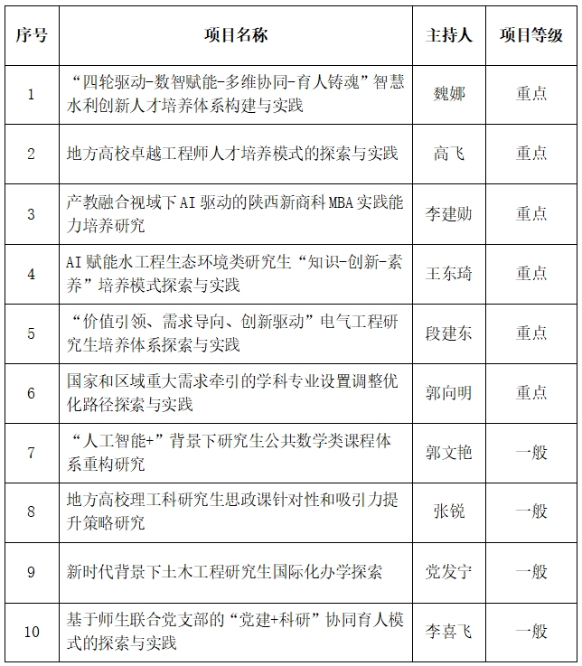 近年来,学校锚定“一流研究生教育”建设目标,全面落实立德树人根本任务,持续深化教育教学改革创新,出台研究生教育改革总体实施方案,部署推进思政育人质量提升计划、学生科研创新能力提升计划等6大改革举措,常态化开展研究生教育“一年一主题”活动,将价值塑造、知识传授与能力培养有机融合,有效提升了研究生培养质量。下一步,学校将对获批项目实施全过程精细化管理,确保各项改革研究落地生根、开花结果,切实将项目优势转化为育人实效,着力培养更多具备家国情怀、创新精神与实践能力的高层次人才,为助力陕西高等教育强省建设、赋能区域经济社会高质量发展贡献更大力量。