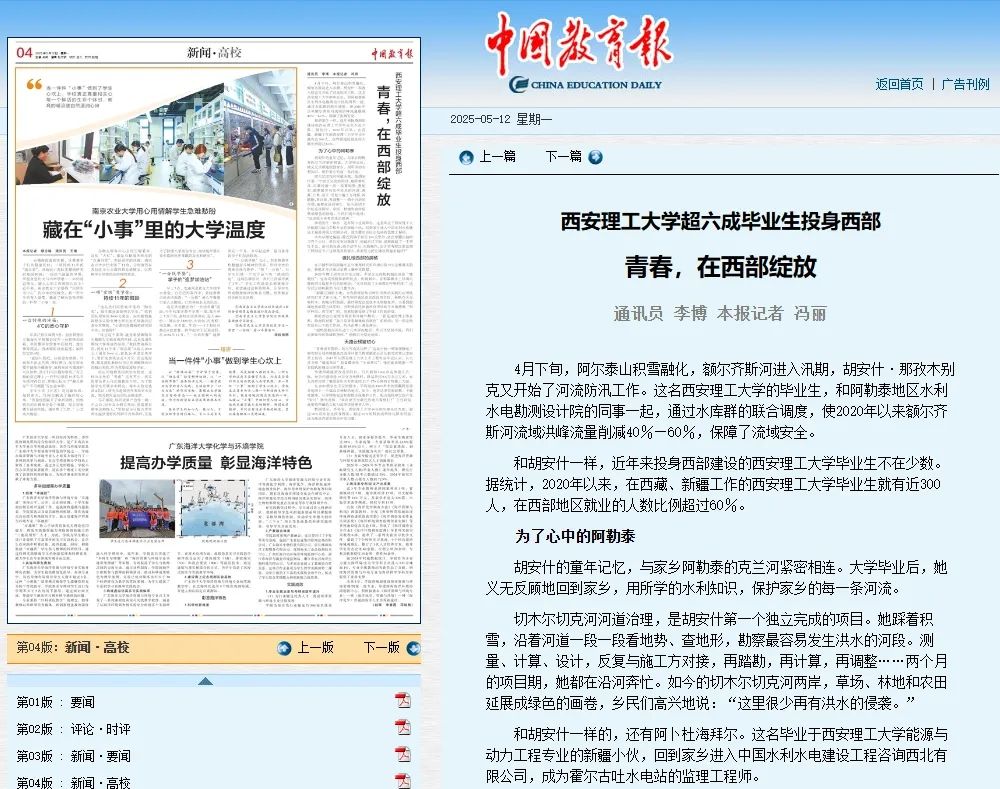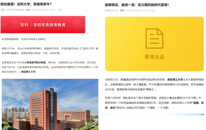 央视五次深度聚焦学校科研团队,从额尔齐斯河“不淹民房只润绿洲”精准调度、盐碱地棉花丰产治理,到文物保护艺术等传统文化现代表达与传承,全景呈现西理工人科研报国的硬核实力与责任担当,获社会各界广泛关注赞誉。相关报道通过《东方时空》、“央视新闻”客户端等平台传播,全网累计播放量超2000万次,引发热烈反响。学校全年获中央级媒体报道62次,其中《人民日报》《光明日报》《科技日报》等17次深度聚焦科技创新、学科布局、人才培养等核心举措;与《中国教育报》《陕西日报》联合推出系列专栏,刊发深度报道8篇,形成长效传播声势。多项国家级、省级重大活动及改革创新、学科建设、科研攻关、学子竞赛等亮眼成果获40余家媒体广泛关注与解读。此外,学子亮相央视五四青年节特别节目及跨年晚会展现青春风采,自研机器人“夸父”登上人民网AI之夜、省政协茶话会等重要平台。