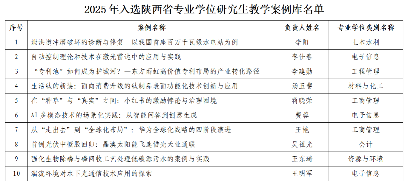 近日,陕西省教育厅办公室、陕西省学位委员会办公室印发《关于公布2025年陕西省专业学位研究生教学案例入库名单的通知》(陕学位办【2026】1号),我校10项专业学位研究生教学案例入选,覆盖多个专业学位类别,呈现出成果质量优异、学科分布广泛、实践导向鲜明的良好格局。