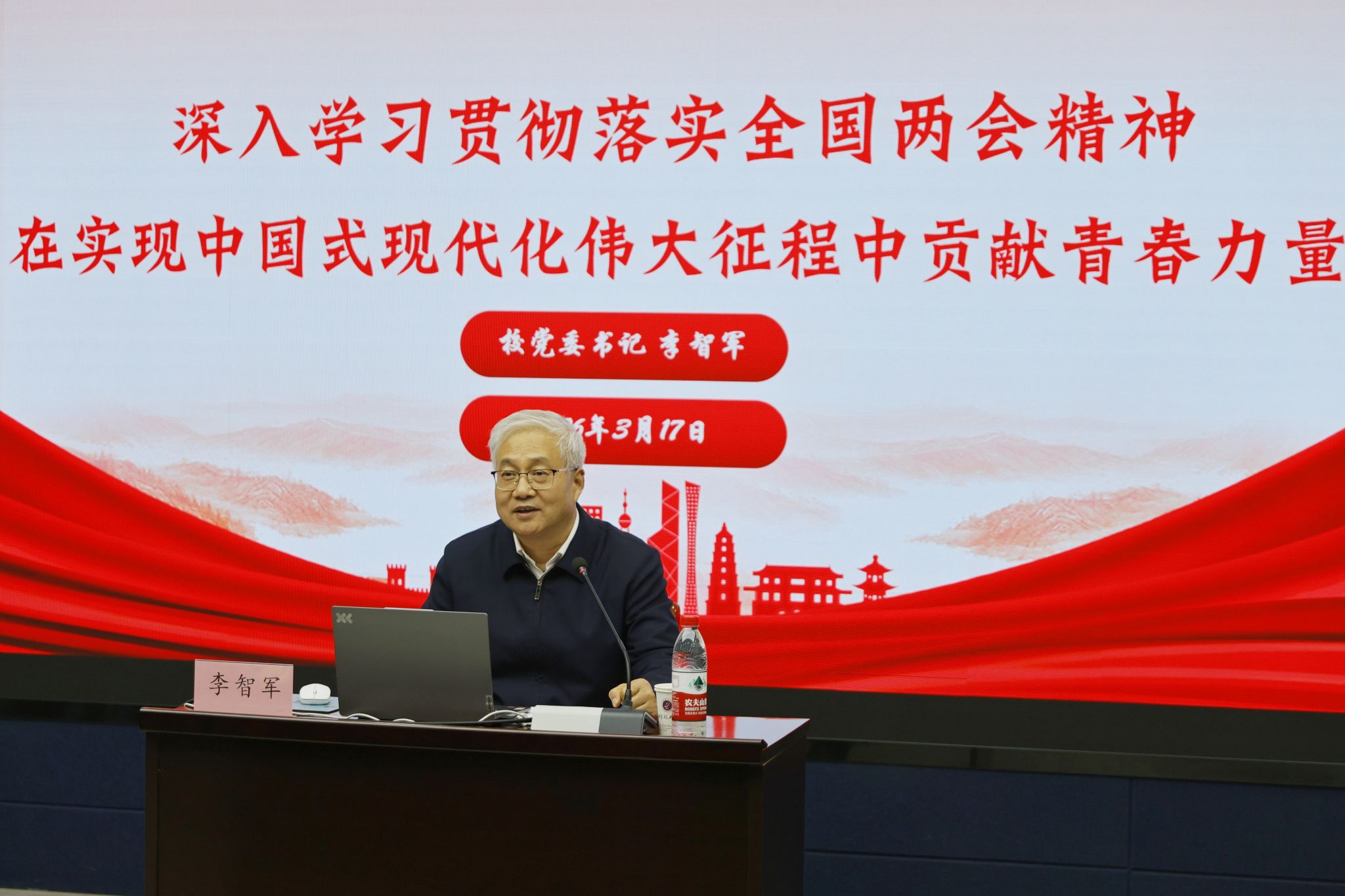 3月17日下午,校党委书记李智军以《深入学习贯彻落实全国两会精神,在实现中国式现代化伟大征程中贡献青春力量》为题,为第十九期青马工程培训班全体学员讲授2026年春季学期开学第一课。