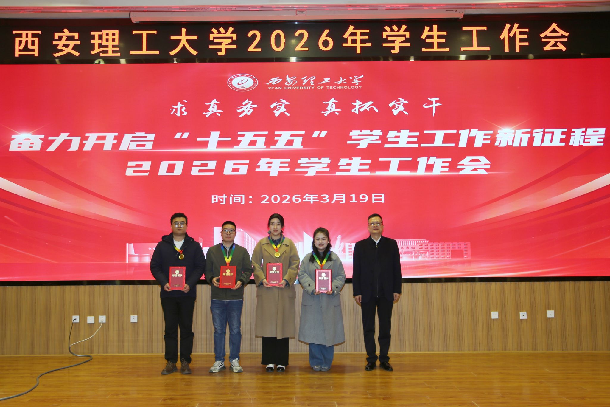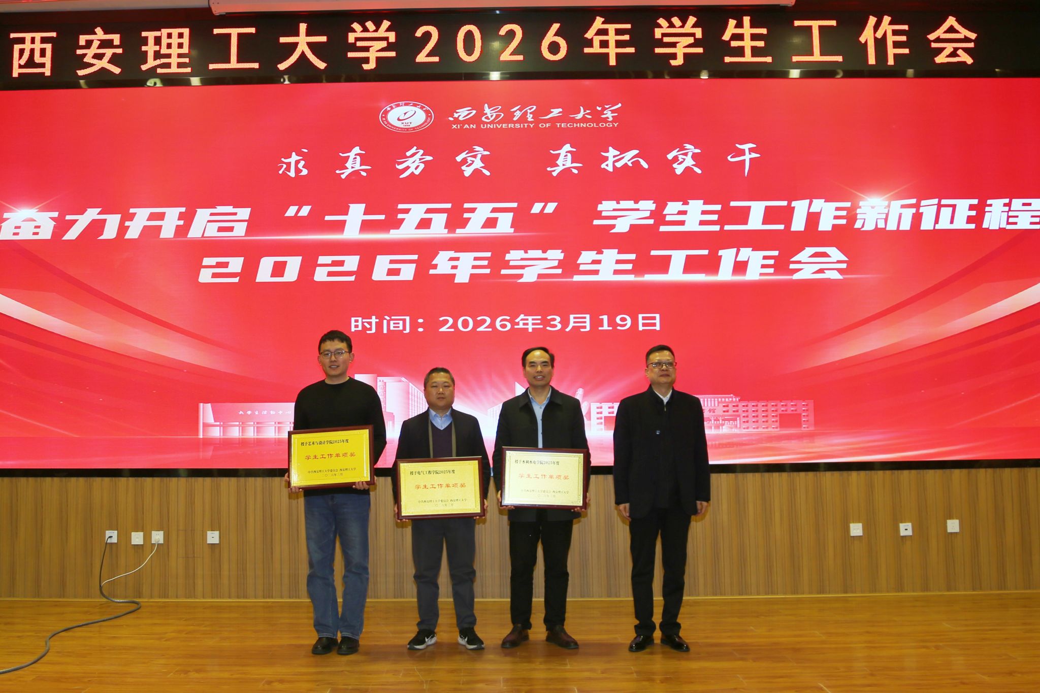 会上,张存库为2025年度学生工作考核优秀学院、第三届全国大学生职业规划大赛陕西赛区决赛金奖选手指导教师颁发荣誉证书。学工部、研工部、校团委、素教中心分别总结2025年工作,各相关工作负责人分别对2026年重点工作任务进行安排部署。