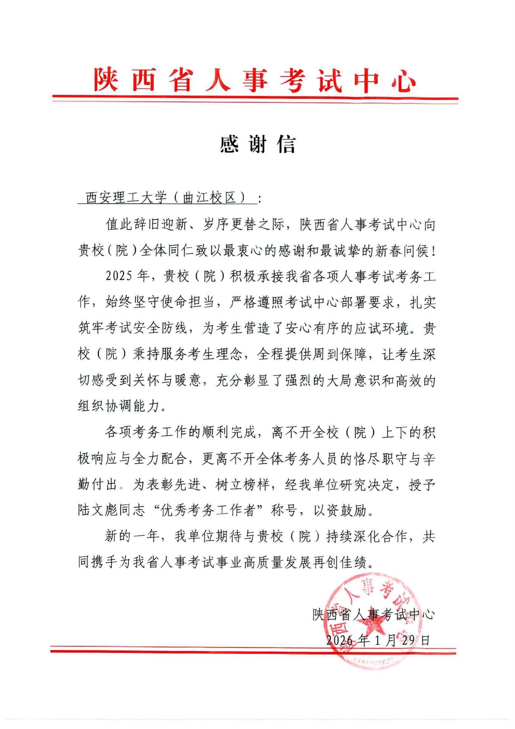 近日,我校收到陕西省人事考试中心发来的感谢信。信中对学校在国家公务员录用考试中的周密部署、精心安排和高水平考务组织,给予了高度肯定与诚挚感谢。