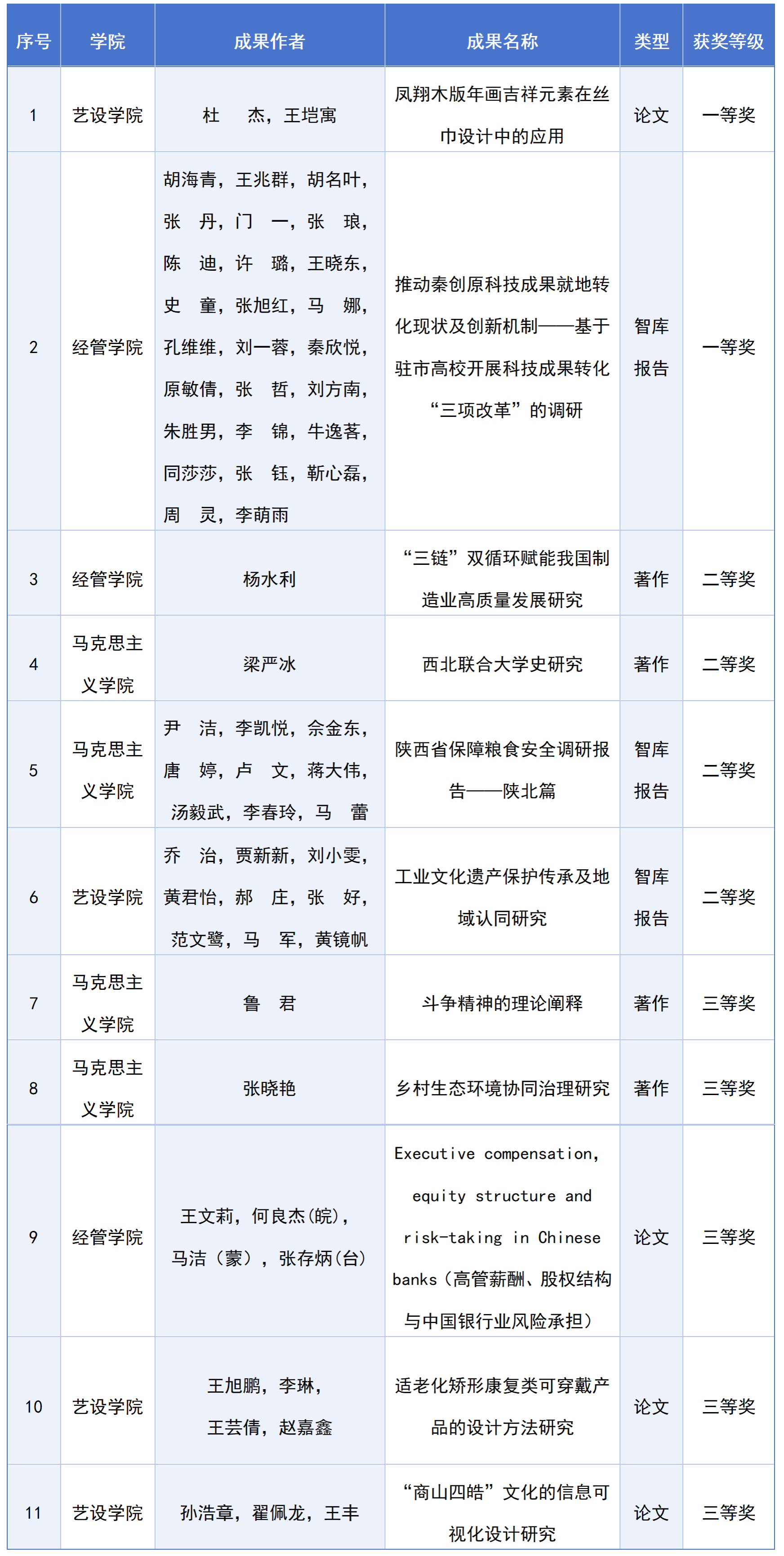 近日,陕西省人民政府发布了《关于表彰第十七次哲学社会科学优秀成果的通报》(陕政字【2026】20号),我校获奖11项,其中一等奖2项,二等奖4项,三等奖5项。