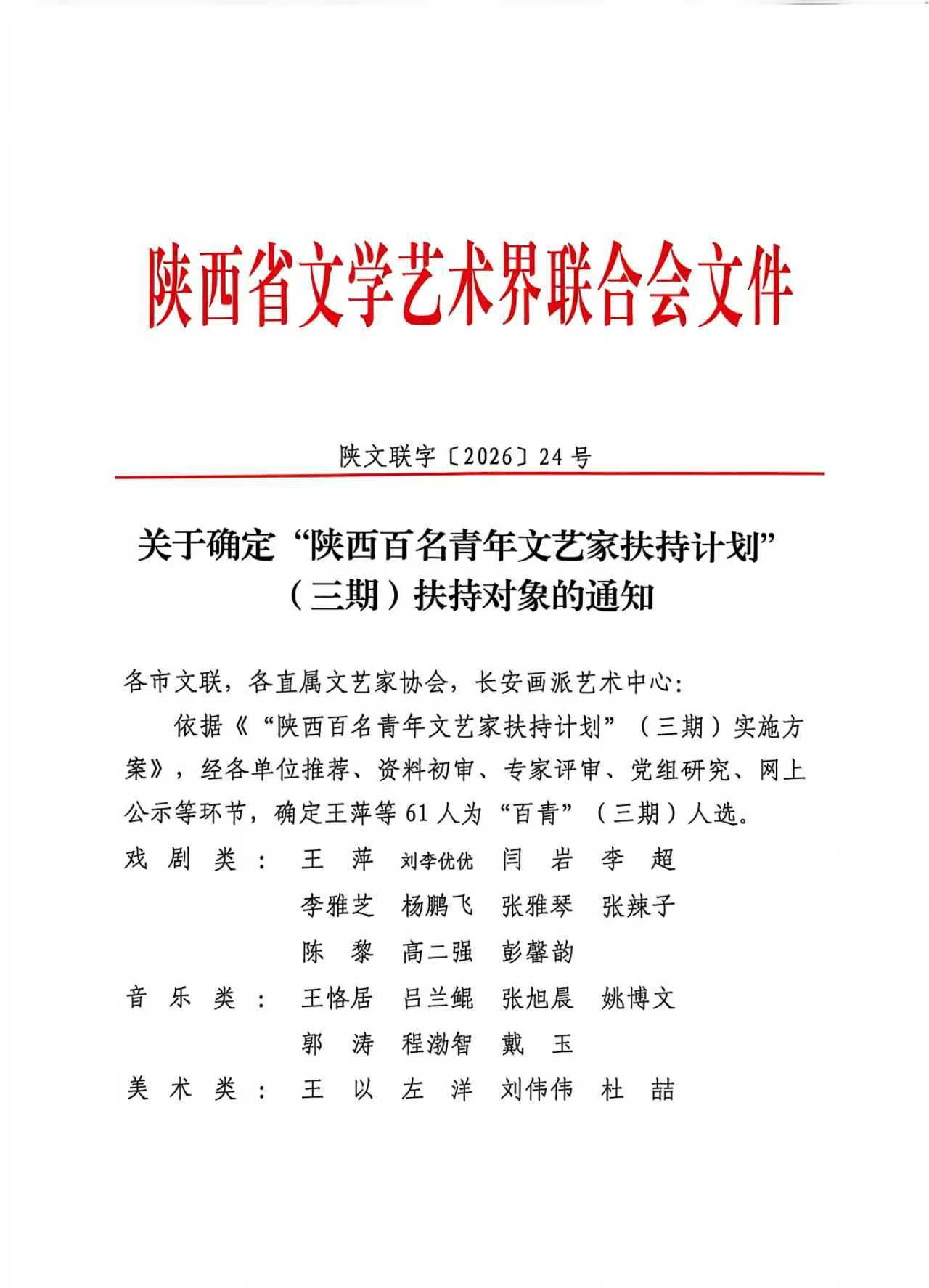 陕西省百名青年文艺家扶持项目由中共陕西省委宣传部、陕西省文学艺术界联合会主办,是陕西省加强青年文艺人才培养、推动文艺事业繁荣发展的重要举措。自2014年启动实施以来,围绕青年文艺人才培养,通过项目扶持、研修培训、采风交流、宣传推广等方式,持续发现、培养和扶持优秀青年文艺人才,为陕西文化强省建设提供有力人才支撑。截至2026年2月,该项目已累计扶持青年文艺人才168名,累计拨付资金3700万元,覆盖戏剧、美术、摄影等12个艺术领域。