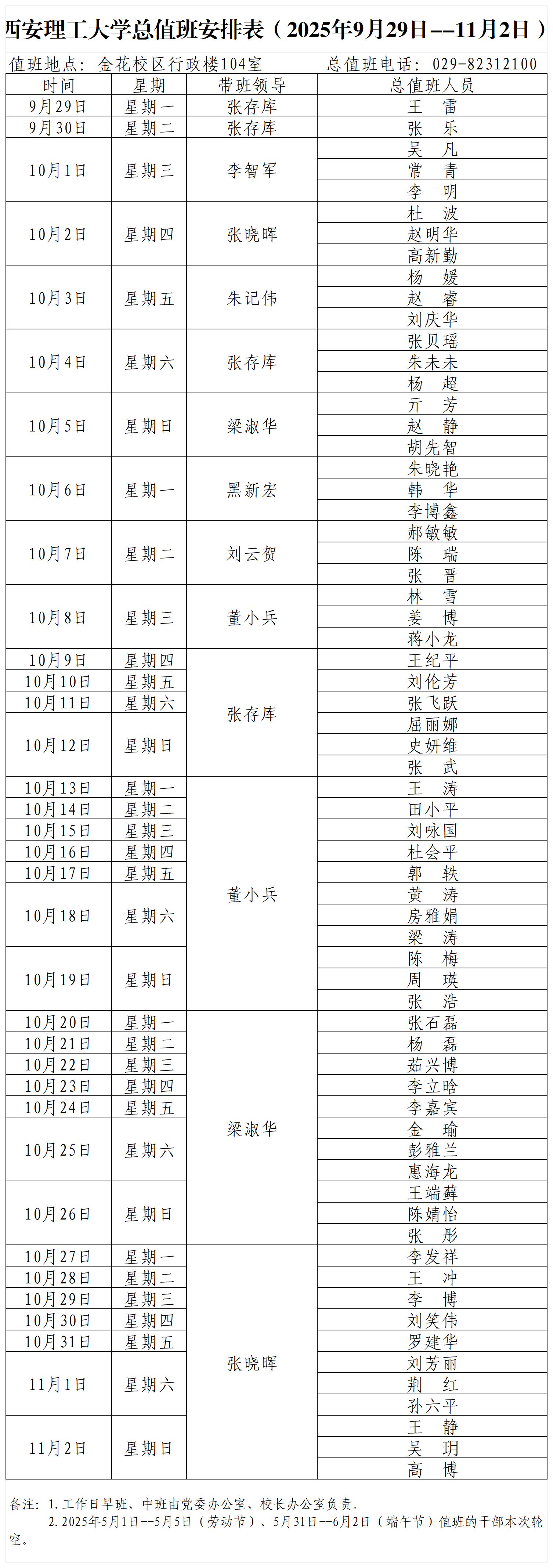 西安理工大学总值班安排表(2025年9月29日--11月2日)