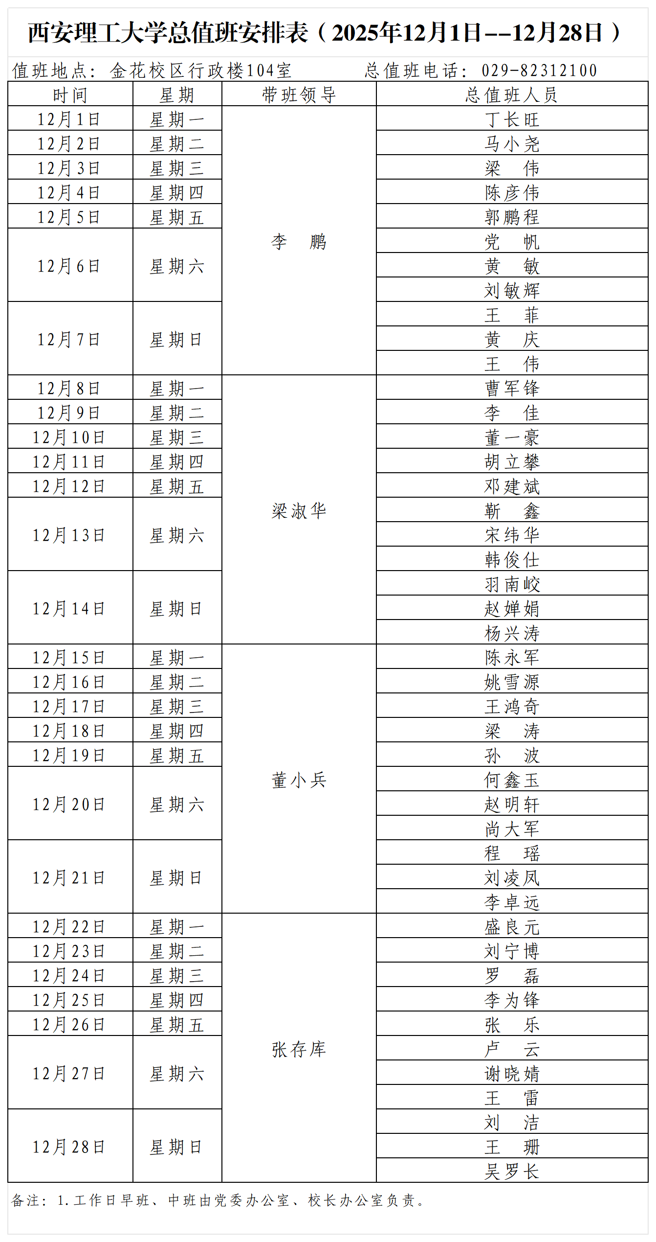 西安理工大学总值班安排表(2025年12月1日--12月28日)