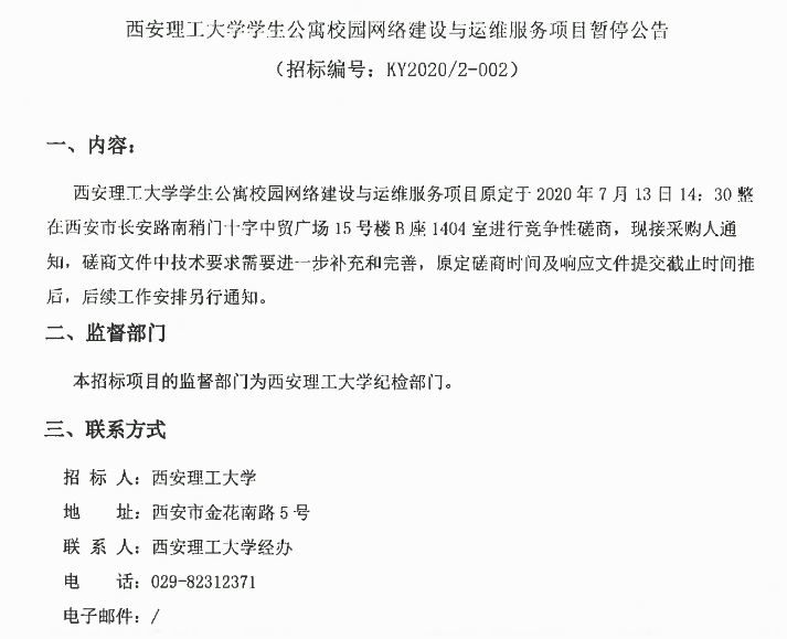 【项目暂停】西安理工大学学生公寓校园网络建设与运维服务项目暂停公告