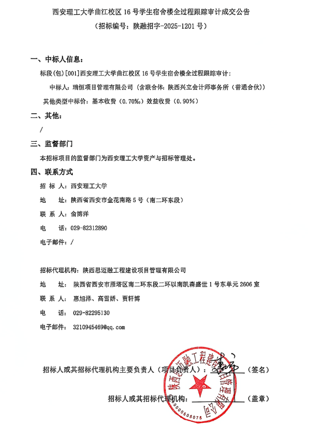 【全过程审计】西安理工大学曲江校区16号学生宿舍楼全过程跟踪审计成交公告