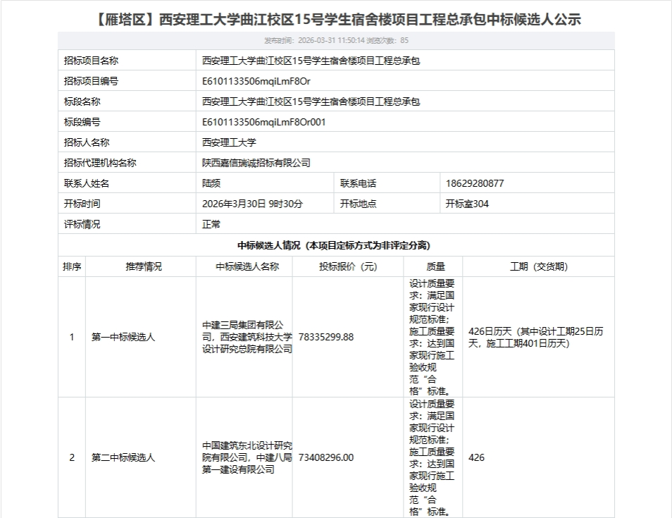 【工程总承包】西安理工大学曲江校区15号学生宿舍楼项目工程总承包中标候选人公示