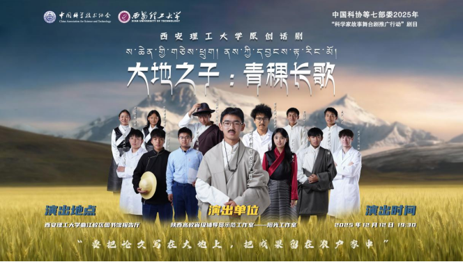 青稞无言,精神不朽。12月12日,我校曲江校区图书馆报告厅内座无虚席,由阳光工作室(陕西高校省级辅导员示范工作室)主创的原创话剧《大地之子:青稞长歌》在此首演。作为中国科协“科学家故事舞台剧推广行动”重点剧目,这部以西藏“青稞之父”尼玛扎西生平为蓝本的作品,既是触动人心的艺术盛宴,更是学校落实立德树人、铸牢中华民族共同体意识的生动实践。