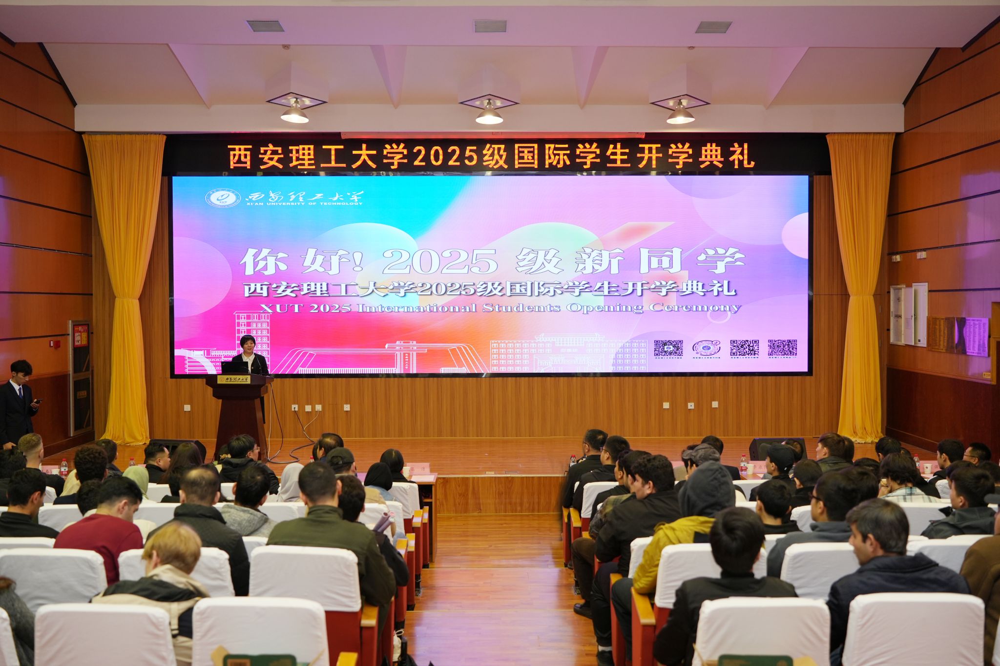 土木建筑工程学院书记刘峰、副书记王宗强、副院长胡义锋、郭宏超、薛海斌,人文与外国语学院院长张洁,水利水电学院副书记李永阳,计算机科学与工程学院副院长费蓉,电气工程学院副院长宋卫章,印刷包装与数字媒体学院副处级辅导员赵琦元,国际合作与交流处副处长蒋小龙,相关学院教师代表、在校国际学生,以及2025级全体国际学生等近200名师生参加典礼。